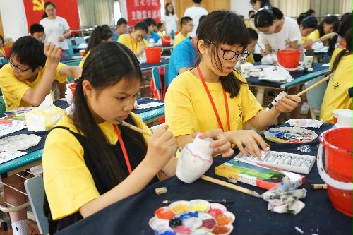 7月30日,夏令营营期过半,为激发营员们的创造能力,上午,夏令营为营员们准备了两个活动---画花雕酒罐和绘脸谱。