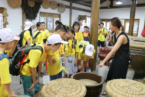 下午营员们来到了黄酒博物馆。一进馆内,黄酒飘香,营员们满怀好奇地探望周围。讲解员讲解了黄酒的起源,让营员们品尝了黄酒,同时还让他们亲自感受酿酒的过程,对于营员们最美好的回忆还是品尝当地特色的黄酒棒冰,味道格外解渴、甜美。