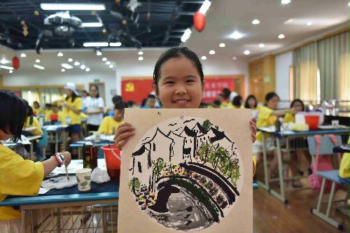 上午画的是“水墨中国画——绍兴古桥”,营员们昨天才走过绍兴的古桥,水乡的小桥流水,桨声欸乃仍历历在目,诉诸笔端,更加得心应手。