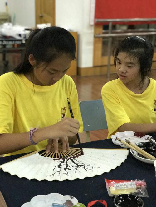 夏令营开营第三天,营员们迎来了为期一天的中国画课程。绍兴文理学院美术学院的陈清老师已经是第四年担任夏令营国画课的主教了,她细心地教导营员们,手把手教他们如何用毛笔勾勒出优美的线条。